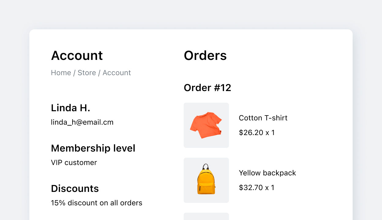 Offer customers the convenience of their own accounts, where they can log in at any time and view their order status, member discounts, invoices, and make new purchases. This creates a customized experience, and encourages their return.