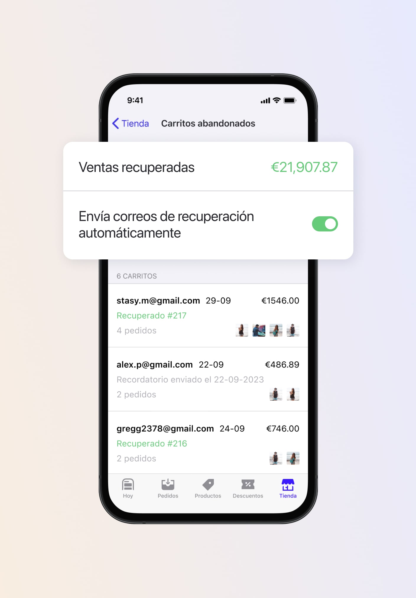 Mantente conectado con correos electrónicos automatizados desencadenados por acciones de los clientes, como seguimientos posteriores a la compra o recordatorios de carrito abandonado.