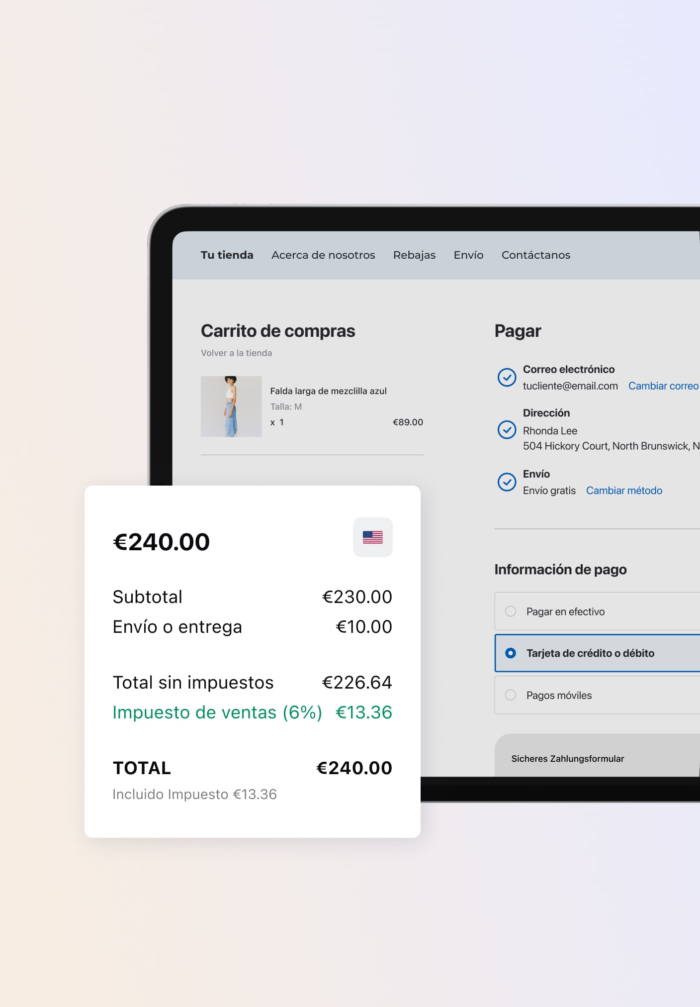 Los impuestos no tienen por qué ser una molestia. Calcula las tasas de impuestos automáticamente en la caja en función de la tienda y la ubicación del cliente en tiempo real.