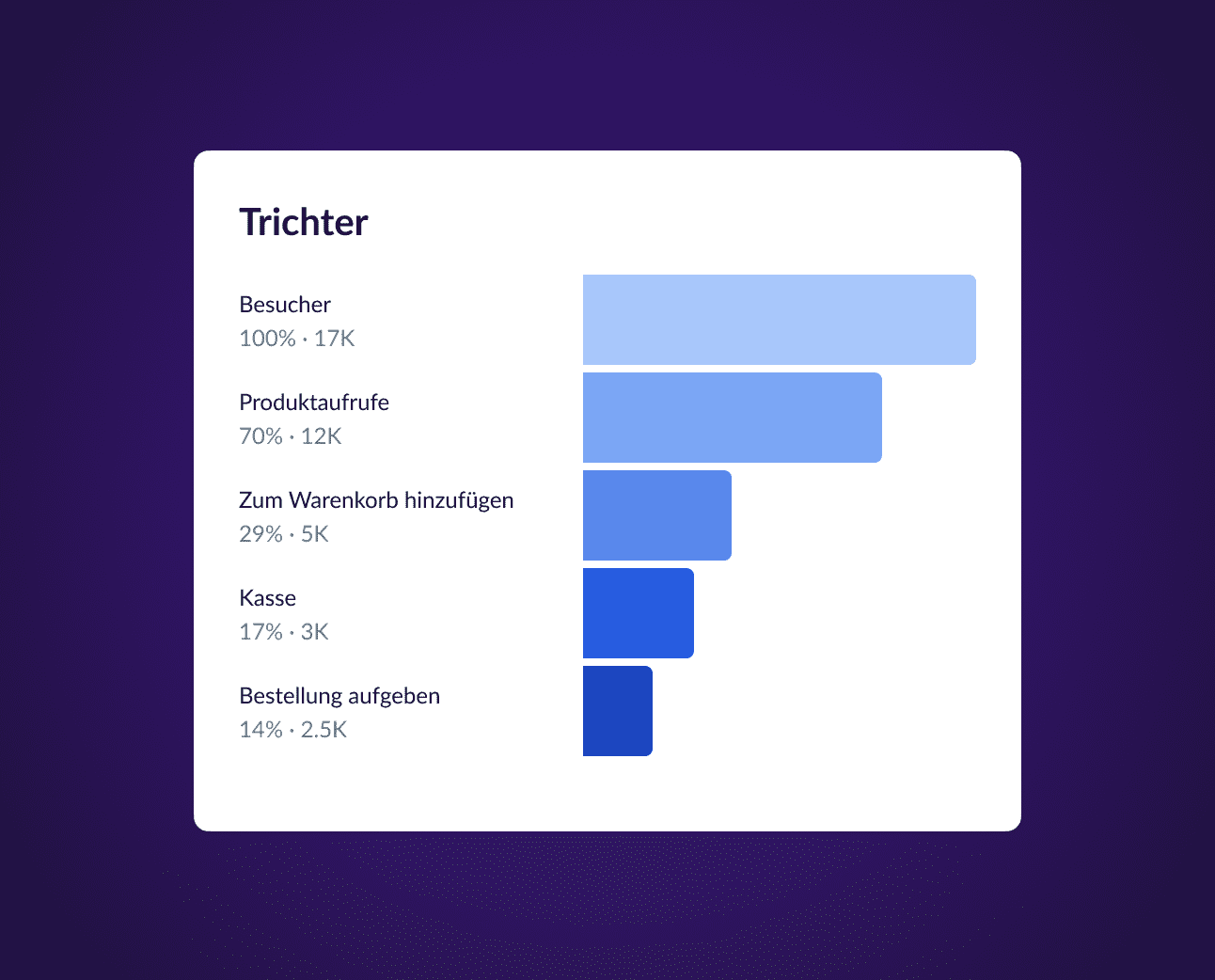 Messe die Leistung aller Schritte des Trichters, von den Seitenbesuchen bis zu den abgeschlossenen Käufen